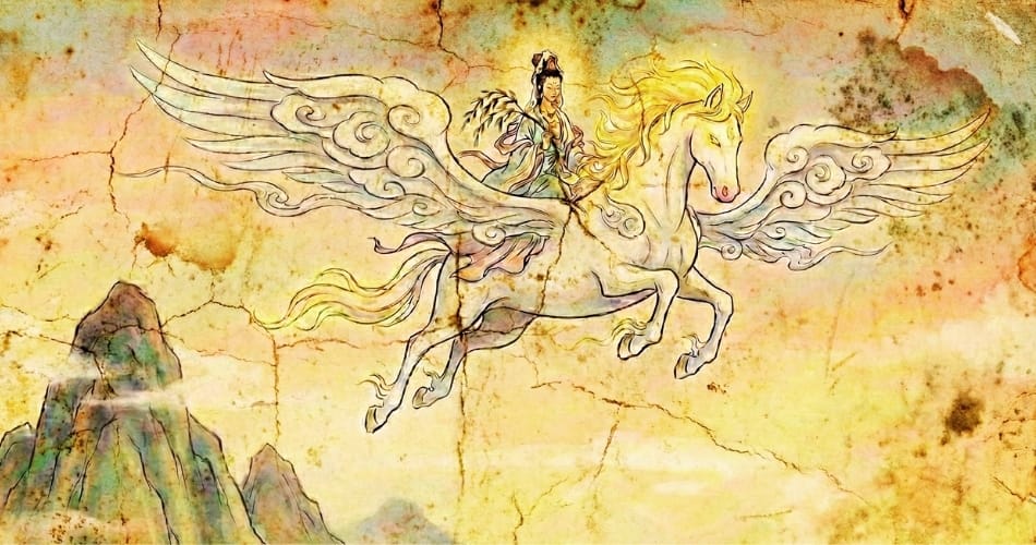 According to the Chinese, a magical horse has supernatural powers, is heroic, strong and can even fly! A White Celestial Cloud Horse is sacred to the Chinese Goddess of Mercy Guanyin. Her white horse flies through the heavens, bringing peace and good tidings. The horse is a hero in China because important battles were won due to the power and strength of the horse. Genghis Khan (also a horse) conquered Eastern Europe on horseback (马上治天下 mǎshàng zhì tiānxià), consequently Chinese have high expectations of the horse – leaving the heavy lifting to the ox and getting on their high horse – sitting on horseback implies that a person is from a high ranking family, so people born in a Horse Year care about their dress and speech.